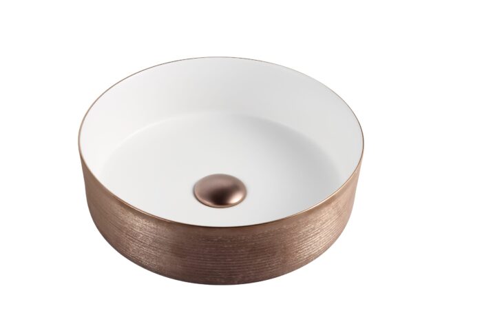 כיור מונח חרס עגול מיוחד | קוטר 36 ס"מ | רוז גולד מוברש ובפנים לבן מט PVD
